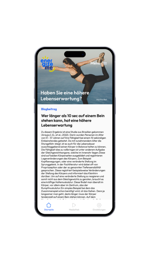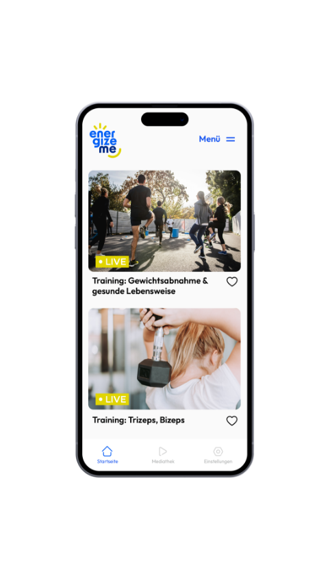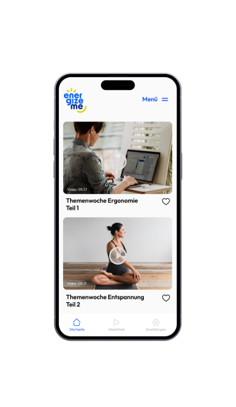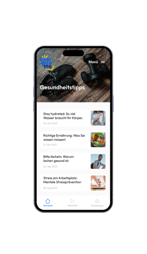 energizeme ist die einfache und zielführende Gesundheits-App für alle Menschen im Unternehmen. Sie sorgt aktiv für mehr Gesundheit und Steigerung des Wohlbefindens aller Mitarbeitenden: mit regelmäßigen Gesundheitstipps und Übungen über Live-Streams, Videoclips und Blogbeiträge. Direkt auf dem Smartphone der Mitarbeitenden.